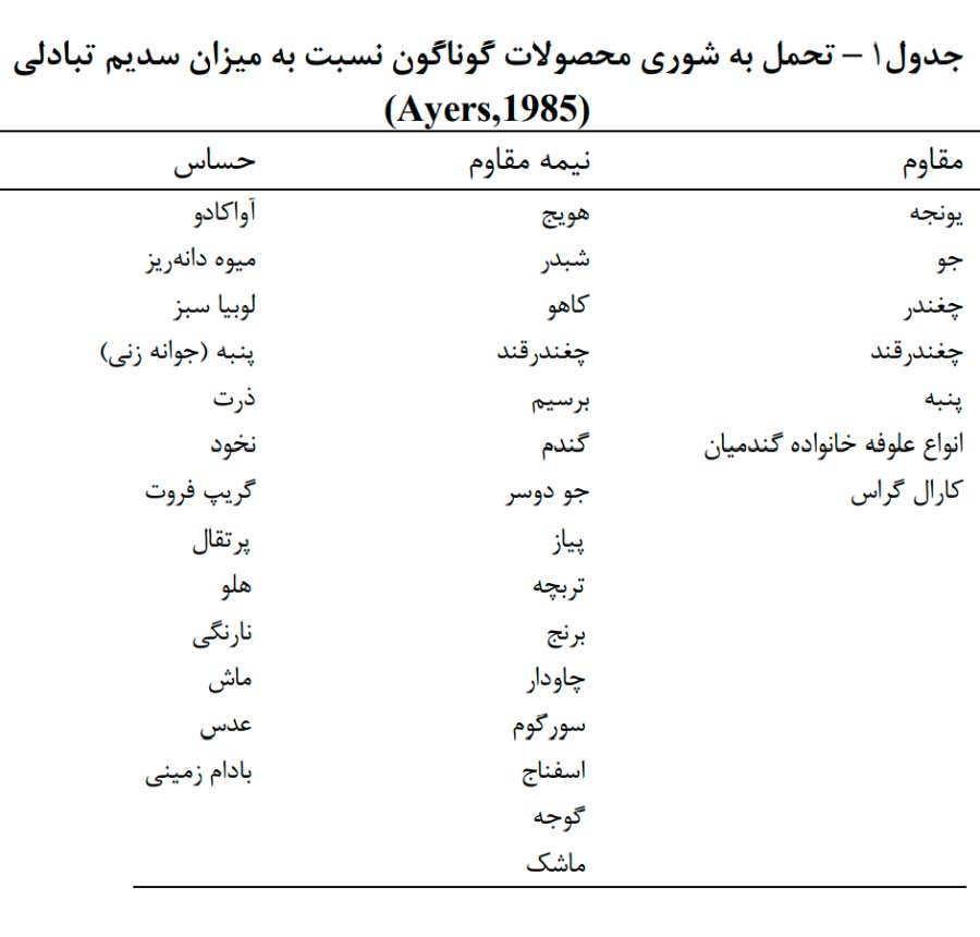 جدول تحمل به شوری محصولات گوناگون نسبت به میزان سدیم تبادلی