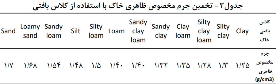 جدول تخمین جرم مخصوص ظاهری خاک با استفاده از کلاس بافتی