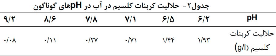 جدول حلالیت کربنات کلسیم در آب در pH های گوناگون