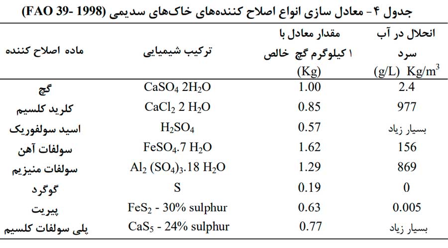 در حالتهای خاص در صورتی که از اصلاح کننده های دیگر مانند گوگرد برای اصلاح خاک استفاده شود (Miyamoto, 1975) باید از جدول 4 به منظور محاسبات کمک گرفت. در این جدول مقادیر معادل گچ نشان داده شده است.