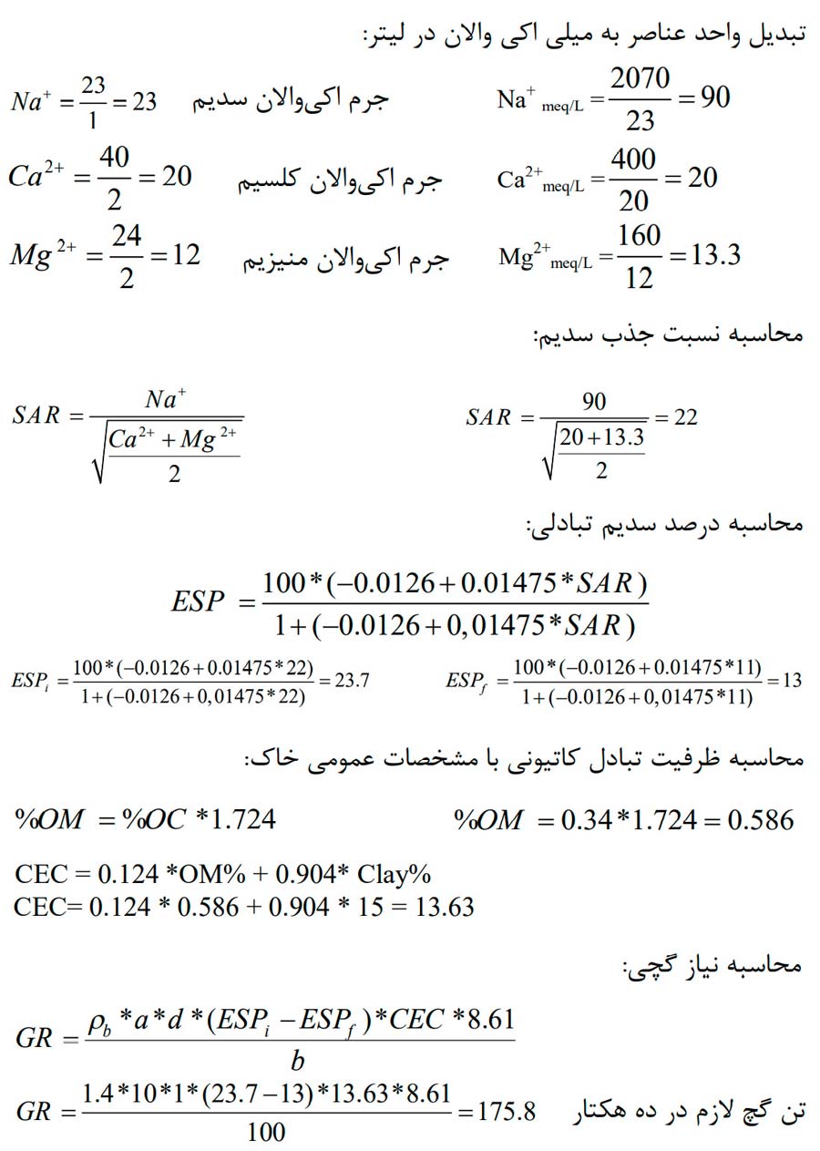 هدف اصلی مصرف گچ در اصلاح خاکهای شور و سدیمی ، ورود مقادیر بیشتر کلسیم به خاک و جایگزینی آن با سدیم اضافی موجود روی سطوح تبادلی ذرات خاک است. با علم به اینکه واکنش تبادلی طبق قوانین معمول شیمی با اکی والانهای برابر صورت میگیرد ، با محاسبه میزان سدیم اضافی خاک میتوان گچ مورد نیاز را بر اساس رابطه (1) محاسبه کرد. در این بخش روابط مورد نیاز برای محاسبه نیاز گچی بـا عنایت بـه پارامترهای در دسترس و در قالب دو مثال ذکر میگردد.