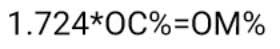 با توجه به اندازه گیری درصد کربن آلی (%OC) در نتایج آزمون خاک از رابطه زیر به منظور تخمین درصد مواد آلی (%OM) استفاده میشود.