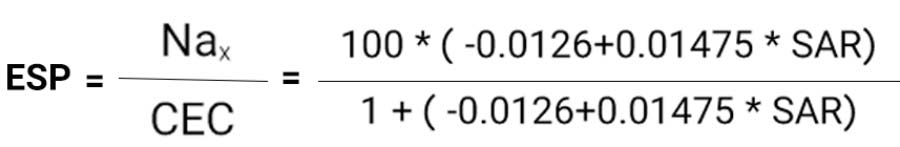 درصد سدیم تبادلی با استفاده از داده های آزمایشگاهی شامل مجموع کاتیونهای تبادلی (CEC) و سدیم تبادلی (Nax) نیاز است که اندازه گیری این پارامترها خصوصا در شرایط شور عملاً با دشواری های زیادی همراه است ، به صورتی که پیشنهاد میشود اگرچه SAR برای آب آبیاری محاسبه میشود ، در صورتی که نتایج تجزیه خاک در دسترس باشد ، بر اساس ترکیب محلول اشباع خاک مقادیر SAR محاسبه شده و با استفاده از رابطه (3) ESP بدست می آید.