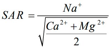 در این رابطه Nax میزان سدیم در فاز تبادلی است که اندازه گیری آن در خاکهای شور و یا سدیمی سخت می باشد. در صورت عدم دسترسی به نتایج آزمایشهای خاک ، مقادیر SAR را میتوان با استفاده از مقادیر کاتیونهای کلسیم ، منیزیم و سدیم موجود در آب آبیاری نیز برآورد کرد. (این برآورد در صورتی که ترکیب محلول خاک با آب آبیاری به تعادل نرسیده باشد، دارای خطای زیادی می باشد اصولاًو از این رابطه در موارد آبیاری طولانی مدت خاک با آب و رسیدن به حالت تعادل و با توجه به خطای موجود و در صورت عدم دسترسی به ترکیب محلول خاک میتوان استفاده نمود).