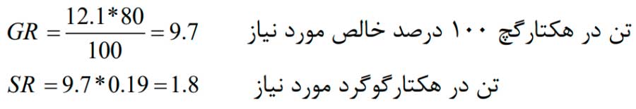برای مثال در صورتی که به جای گچ بخواهیم از گوگرد استفاده کنیم در مثال یک مقدار گوگرد مورد نیاز برای هر هکتار زمین برابر است با (درجه خلوص گچ 80 درصد بود):