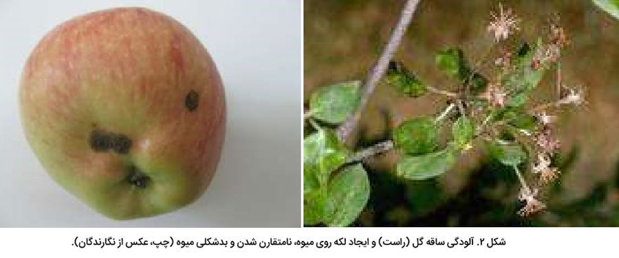 آلودگی گل در طول زمان گلدهی با ظهور لکه های کوچک به رنگ سبز تیره در قاعده گل و کاسبرگها رخ می دهد. آلودگی ساقه دم گل، سبب ریزش میوه های جوان در حال تشکیل شده و افت محصول شدیدی را متوجه باغدار می نماید (شکل 1). میوه های جوانی که در مراحل بعدی رشد و نمو مورد هجوم قارچ عامل بیماری قرار می گیرند، علائم را به صورت لکه های گرد سبز زیتونی، گاه احاطه شده با هاله قرمز، نشان داده که این لکه ها به تدریج با رشد میوه به رنگ سیاه تغییر کرده و حالت کرکی پیدا می کنند. سپس با پیشرفت بیماری، بافت پوست میوه های جوان آلوده در مرحله فندقه، به بافتی سخت و چوب پنبه ای تغییر شکل می دهد. در شرایط حاد، پوست میوه دچار ترک های کوچک سطحی تا ترک های بزرگ عمیق شده که گاه تا گوشت میوه نیز نفوذ می کند (شکل ۲). در نهایت میوه ها کوچک مانده، اغلب بدشکل، و بازارپسندی خود را از دست می دهند. لازم به ذکر است که توسعه لکه ها بر روی میوه کندتر از لکه های برگی است (2013 ,Biggs) .