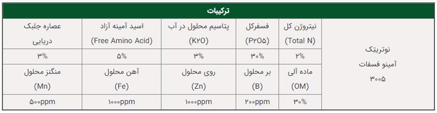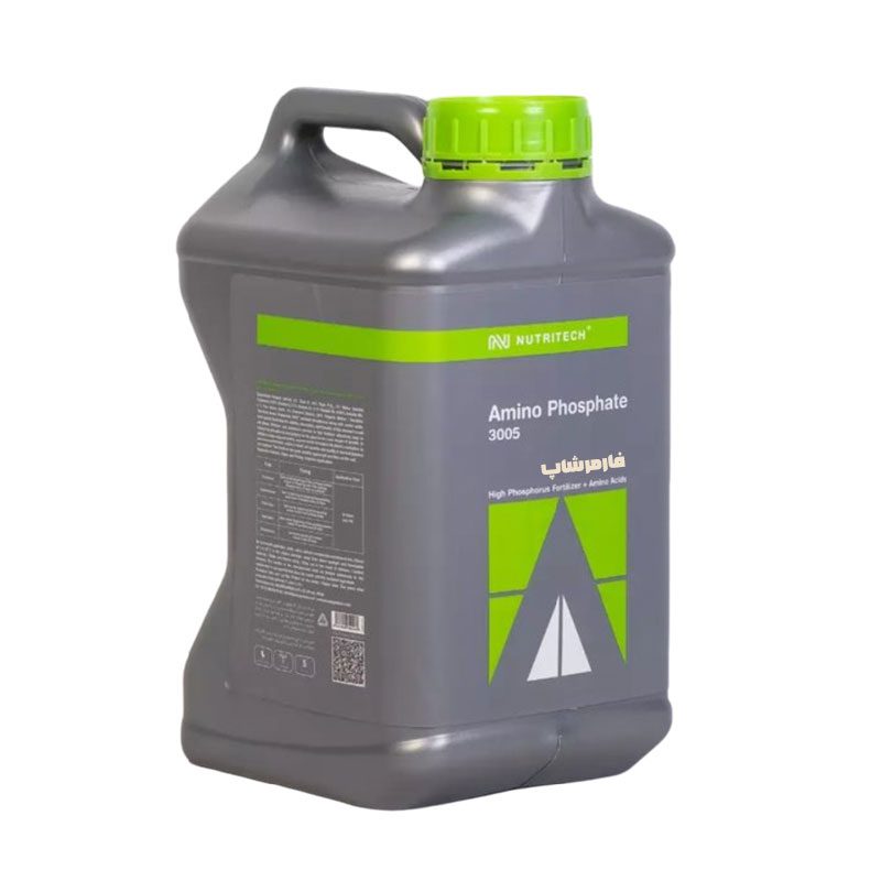کود نوتریتِک آمینو فسفات 3005 کودی حاوی نیتروژن ، فسفر و مقداری پتاسیم و همچنین ترکیب خاصی از اسید های آمینه ، عصاره جلبک دریایی و عناصر ریزمغذی می باشد که برای تأمین عناصر مورد نیاز گیاه بصورت کود آبیاری در ابتدای مراحل رشد رویشی و زایشی جهت افزایش ریشه زایی و گلدهی در تمامی محصولات ، قابل استفاده می باشد.