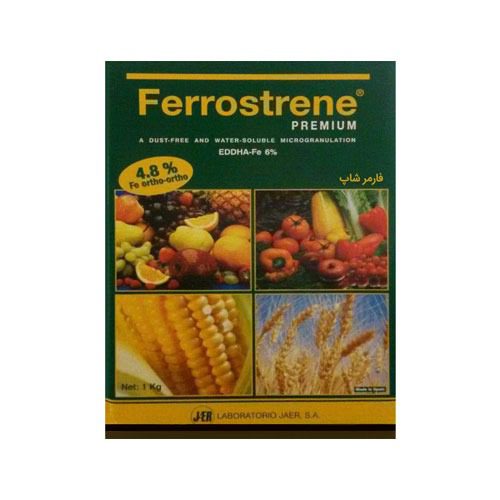 کود آهن فروسترون (6%) کلات شده با EDDHA محصول شرکت Jaer . S.A اسپانیا می باشد این کود با دارا بودن میزان ۴٫۸% آهن کلات شده به شکل ارتو-ارتو میتواند علاوه بر پایداری مناسب در خاکهای قلیایی و آهکی و رفع کمبود آهن در یک بازه زمانی نسبتاً طولانی، بخشی از آهن خود را به سرعت آزاد کرده و در شرایط کمبود شدید آهن، این عنصر را به سرعت در اختیار گیاه قرار دهد.ferrostrene تنظیم کننده میزان آهن در خاکهای آهکی و کلسیم دار برای کلیه محصولات زراعی و باغی (درختان میوه، مرکبات، درختان انگور، کلیه گلها و گیاهان زینتی و توت فرنگی) می باشد. این کود به دلیل حلالیت بالا و قابل حل بودن قابلیت استفاده در سیستمهای آبیاری قطره ای ، بارانی ، تحت فشار و همچنین محلول پاشی و روش مصرف خاکی ( توصیه می شود پس از استفاده از این ترکیب به روش مصرف خاکی آبیاری انجام شود) را برای جبران کمبود آهن و جلوگیری از بروز علائم کمبود آهن را داراست.