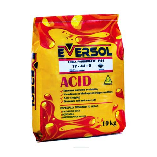 کود اوره فسفات اورسول ( 0-44-17 ) بیشترین حلالیت را (960g/L at 20 o C) در میان کل ترکیبات فسفره دارد. همچنین ترکیبی مختص اسیدی کردن خاک های آهکی و قلیایی است که با کاهش PH محیط و حذف بیکربنات آب موجب حلالیت بالاتر عناصر ریزمُغذی می شود. این ترکیب با کاهش سختی آب به طور مؤثری موجب جلوگیری از رسوب گذاری در لوله ها و تجهیزات آبیاری قطره ای، دریپرها و نازلها گشته و هرگونه نیاز به شستشوی اسیدی و تعویض زودهنگام تجهیزات را برطرف می سازد و تنها اسید قوی به شکل جامد است که خطرات اسیدهای مایع را ندارد. EVERSOL P44 نقش بسزایی در افزایش ریشه زایی در ابتدای کاشت، کمک به پنجه زنی و استقرار گیاهان گلخانه ای و زراعی همچون گندم، جو، برنج ، ذرت، سبزیجات، صیفی جات و… دارد. همچنین سبب توسعه ریشه و افزایش قدرت جذب درختان و محصولات باغی در ابتدای فصل می گردد. نقش مؤثر اوره فسفات P44 در افزایش تعداد غوزه های پنبه و جلوگیری از کوتولگی بوته ها، بهبود کیفیت غده ها در سیب زمینی، جلوگیری از پیچ خوردگی برگ ها در انگور، بهبود شکل گیری مغز در گردو و جلوگیری از ترشح صمغ بر روی شاخه مرکبات به اثبات رسیده است.