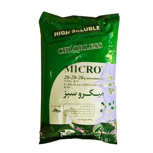 کود بیست بیست بیست میکرو سبز گیاه با داشتن عناصر غذایی نیتروژن ، فسفر و پتاسیم با نسبت یکسان و همچنین دارا بودن عناصر کم مصرف آهن، روی، منگنز، مس، بور و مولیبدن به عنوان یک کود عمومی برای محصولات مختلف زراعی و باغی در طی فصل رشد مورد استفاده قرار میگیرد. کود بیست بیست بیست میکرو سبز گیاه با درصد خلوص بالای عناصر غذایی بر اساس شرائط اقلیمی ایران ساخته شده به گونه ای که عناصر غذایی حداکثر جذب از طریق ریشه و همینطور سطح برگ را دارا می باشند. این کود با داشتن مواد نگهدارنده به خوبی روی سطح برگ پخش و به راحتی از طریق کوتیکول برگ جذب شده و در ساختار فیزیولوژیکی گیاه وارد می شود. میکرو سبز به لحاظ داشتن متناسب عناصر غذایی از ابتدا تا انتهای فصل رشد گیاه قابل مصرف می باشد. کود بیست بیست بیست میکرو سبز گیاه قابلیت استفاده از طریق آب آبیاری را دارا می باشد و شرائط تحمل در برابر آبهای با بی کربنات و pH بالا را دارد بنابراین به راحتی میتواند از طریق آب آبیاری و سیستمهای آبیاری تحت فشار بدون ایجاد رسوب و گرفتگی مورد استفاده قرار گیرد.