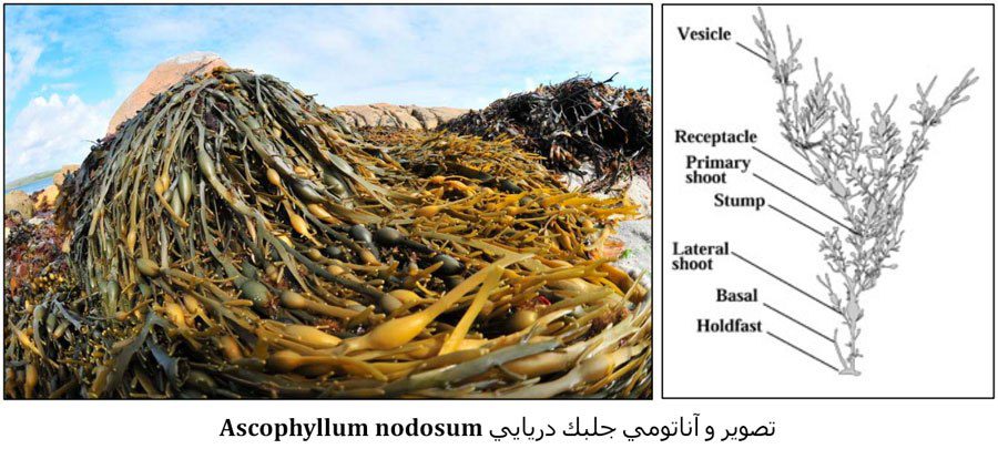 گونه Ascophyllum nodosum یک جلبک قهوه ای بزرگ از خانواده Fucaceae می باشد که در طول سواحل کم عمق و نواحی مردابی آبهای سرد شمال آتلانتیس در کانادا و آمریکا و نیز در سواحل شمال غربی اروپا رشد میکند. این گونه قادر به رشد و تکثیر در آبهای گرم شمال ، مرکز آتلانتیس ، اقیانوس آرام و اقیانوس هند نمی باشد. گونه Ascophyllum nodosum دارای برگهایی به نام Frond (ساقه های برگ مانند) می باشد که دارای ساختارهایی تخم مرغی شکل (Vesicle) هستند که به صورت پشت سرهم واقع شده اند. این جلبکها توسط ساختار قلاب مانندی به صخره ها و تخته های سنگ متصل می شوند.