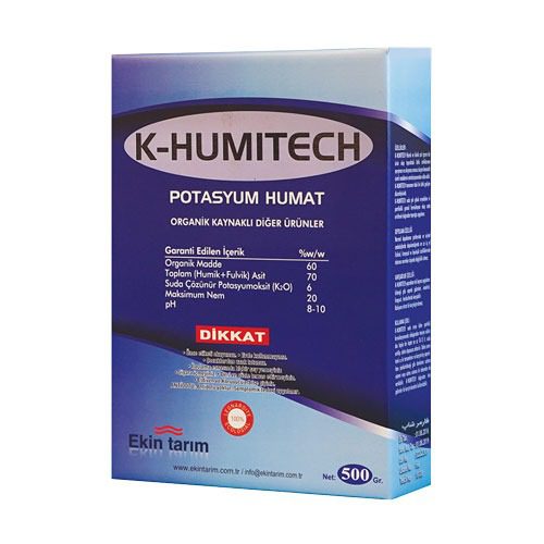 کود کی هیومی تک ، هیومیک پودری شرکت اکین تاریم (ekin tarim) شاخص ترین کود تغلیظ یافته مواد هیومیکی می باشد. این ترکیب حاوی اسید هیومیک تغلیظ یافته بر پایه هیومات و فولوات پتاسیم می باشد که از بهترین معادن لئوناردیت دنیا استخراج شده است . کود کی هیومی تک یک تنظیم کننده رشد گیاه بوده و ماده ای میکرو گرانوله با فرمولاسیون قابل حل در آب می باشد. ساختمان خاک را بهبود بخشیده و باعث افزایش تهویه خاک می شود و در نتیجه ظرفیت نگهداری آب در خاک را نسبت به مواد معدنی خاک افزایش می دهد و به راحتی نیز آب را در اختیار گیاه قرار می دهد. این کود دارای درصد بالایی فولویک و ظرفیت تبادل کاتیونی بسیار بالا می باشد که ویژگی کلات کنندگی فلزات و حفظ رطوبت را به صورت قابل ملاحظه ای افزایش داده و آنرا در مقایسه با سایر کودهای مشابه برتر می سازد. K-humitech باعث افزایش رشد ریشه گیاه شده و اثرات تنش های محیطی مانند تنش شوری و کم آبی را تعدیل می نماید. Khumitech بدون ذرات بوده و عاری از آلاینده های فلزی است.